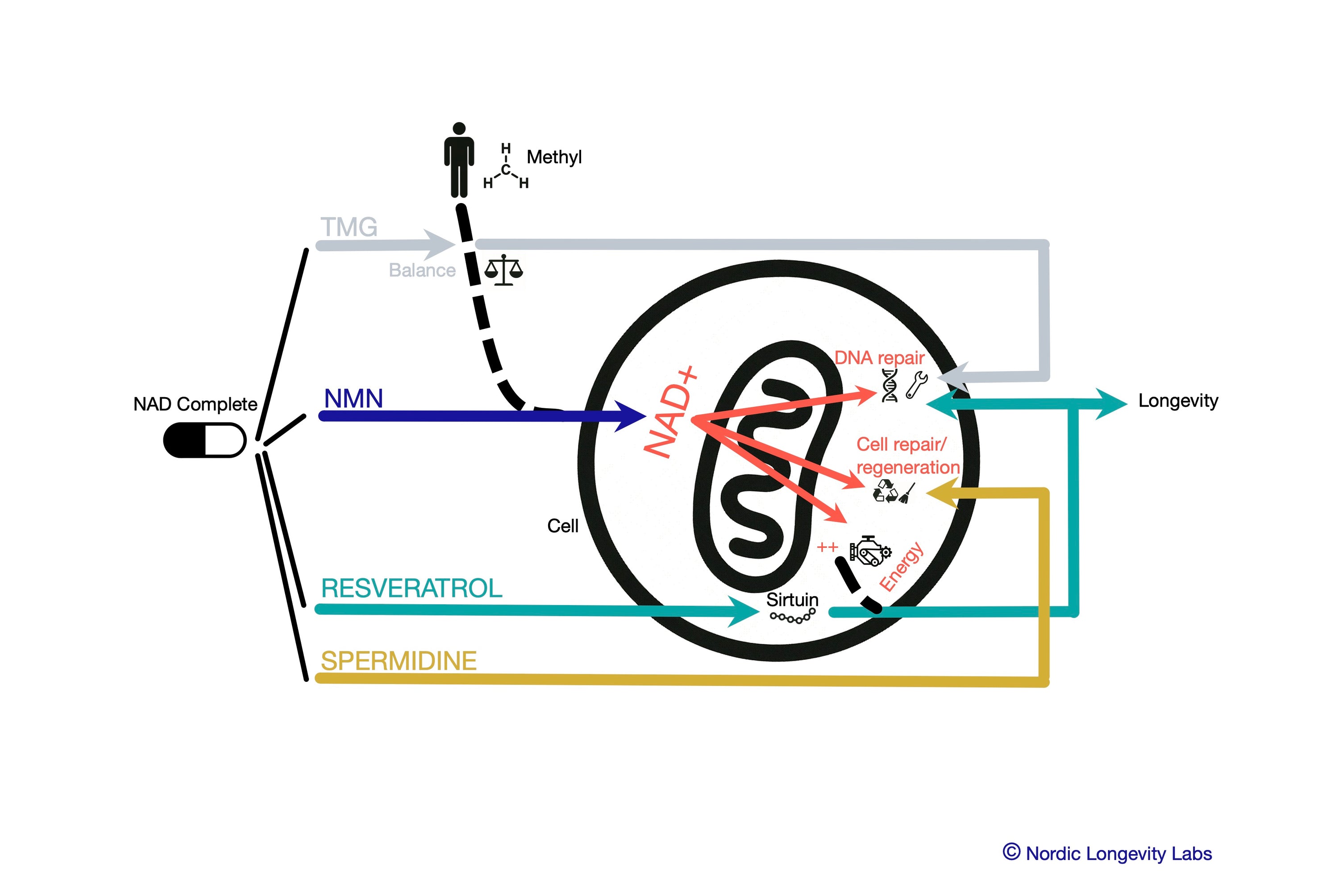NMN increases the body's NAD⁺ levels, providing cells with more energy, while TMG ensures balance in the methylation process. Together, they support focus, endurance, and vitality throughout the day.